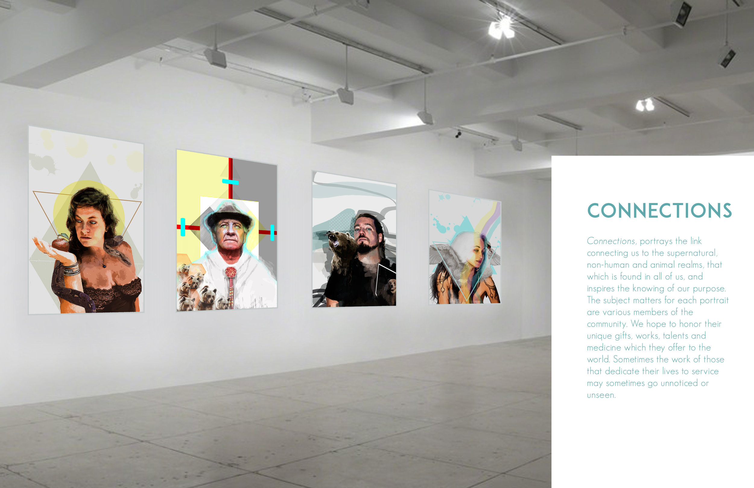 The subject matters for each portrait are activists, artists and healers that have contributed to their community and surrounding Bay Area. Each member was asked to choose a plant or animal which served as a guide or teacher for them. Photographic portraits were taken of each member and then manipulated digitally through illustrator and photoshop.