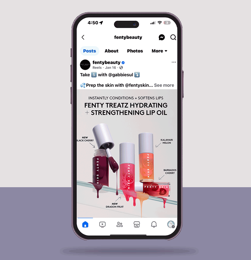 Design graphics for various Paid Platforms, this one showing facebook ad for Fenty Treatz Lip campaign.
